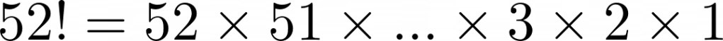 - 52 Factorial: A blog post describing the enormity of 52! (i.e. 52 x 51 x … x 3 x 2 x 1). Vsauce provides a visual version of the game outlined in the post. For more large numbers, consider reading this Wikipedia article, or watching Numberphile’s videos about big numbers.