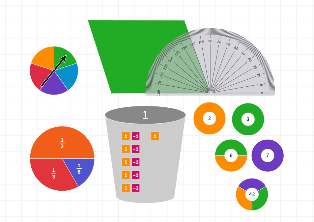 Featured (top left going clockwise): spinner, parallelogram and protractor, prime factor circles, bucket of zero, fraction circles