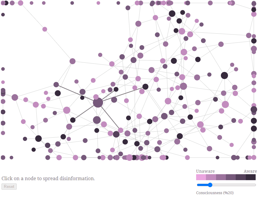 - Post-Truth: An interactive applet that demonstrates a basic model for how disinformation can spread across a network of people (e.g. through social media networks like Facebook or Twitter; rumours across a school playground). You can alter the ‘consciousness’ parameter (bottom right) and observe the extent to which disinformation is able to spread in a mostly connected population.